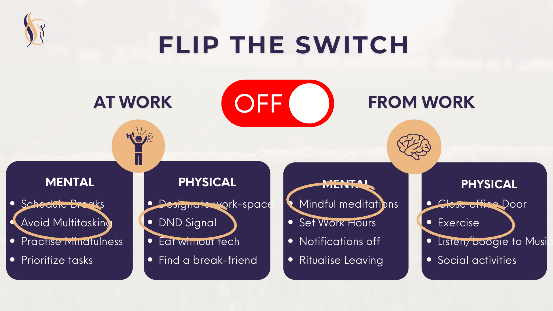 A crucial aspect of work-life boundaries is what I call 'Flipping the Switch'. This involves engaging in activities that help you switch from work mode to personal time, which in turn helps activate your parasympathetic nervous system, putting your body into a relaxed state and reducing stress from the workday. (More on this tool will be discussed later.)