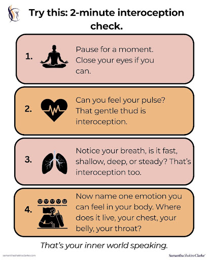 Interoception is your internal GPS, your awareness of what’s happening inside your body. Hunger, heartbeat, breath, tight jaw, fluttery stomach. It’s how you sense your own internal weather.
