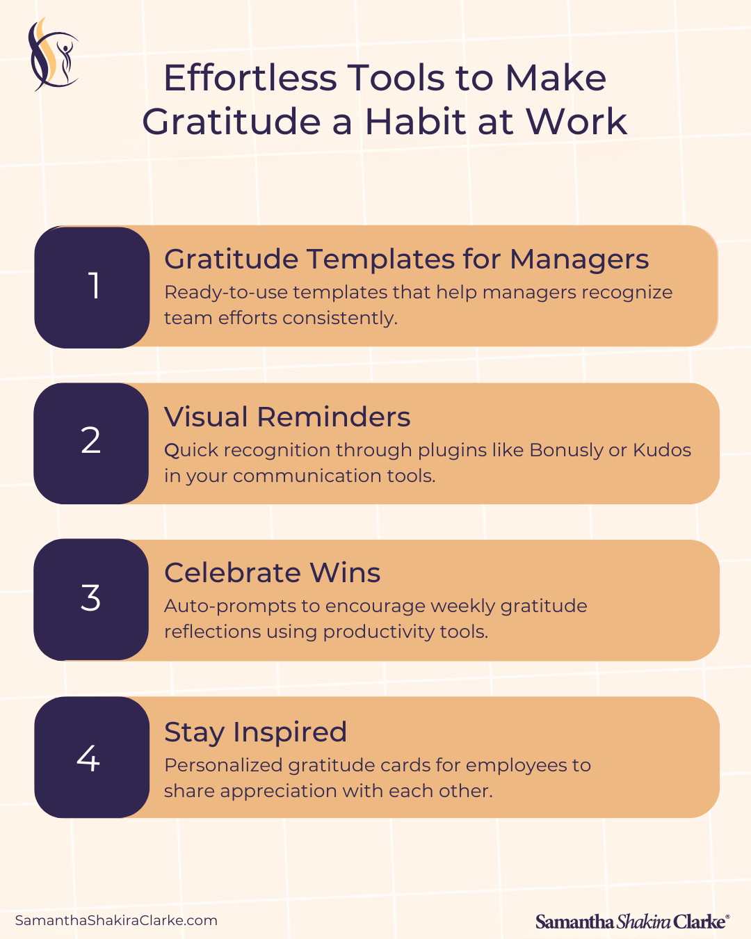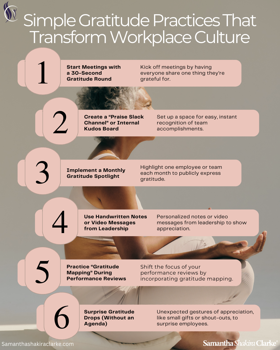 If you're ready to explore how gratitude can elevate your workplace culture, we’d love to help you get started. Reach out to us at team@samanthashakiraclarke.com or schedule a discovery call to learn more about creating a culture of gratitude in your organization. Together, we can unlock the full potential of your team.